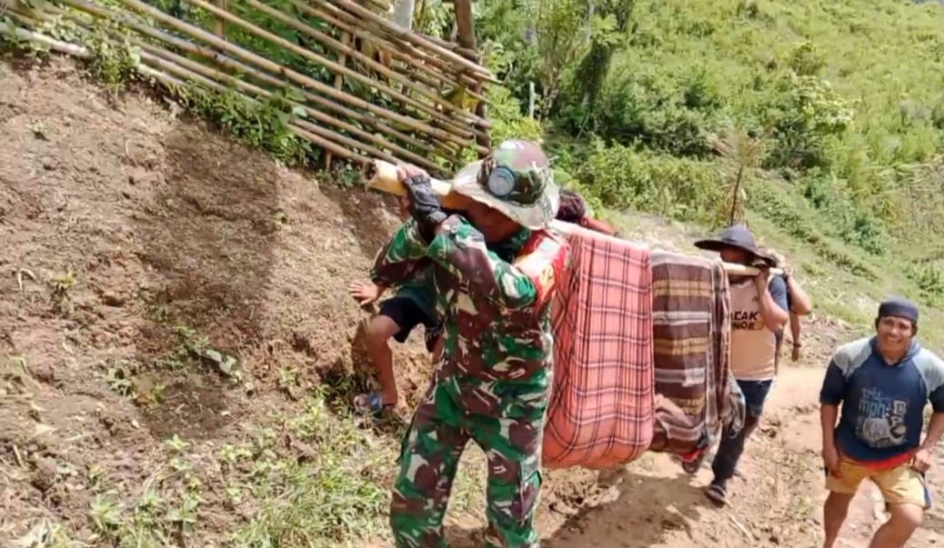 INFORMASIMERAHPUTIH.com | Majene | Serda Suryanto Babinsa Desa Ulumanda Koramil 1404-04/Malunda, kembali menunjukkan wujud nyata keberadaan TNI di tengah-tengah masyarakat. Dalam hal ini membantu proses evakuasi dengan tandu (sebatang bambu dan kain sarung) salah seorang warga di wilayah binaannya guna mendapatkan perawatan medis yang lokasinya berada di wilayah terpencil, Dusun Tamajannang, Desa Ulumanda, Kab. Majene, Sulawesi Barat, Minggu (14/1/2024).