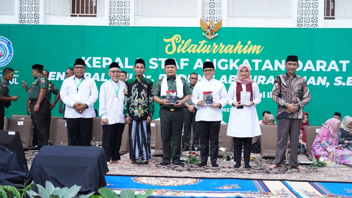 Usai menyampaikan materi Wawasan Kebangsaan, Kasad menyerahkan santunan kepada anak yatim piatu, serta menerima penyerahan buku karya ilmiah dari Ketua MUI Banyuwangi. ( baron )