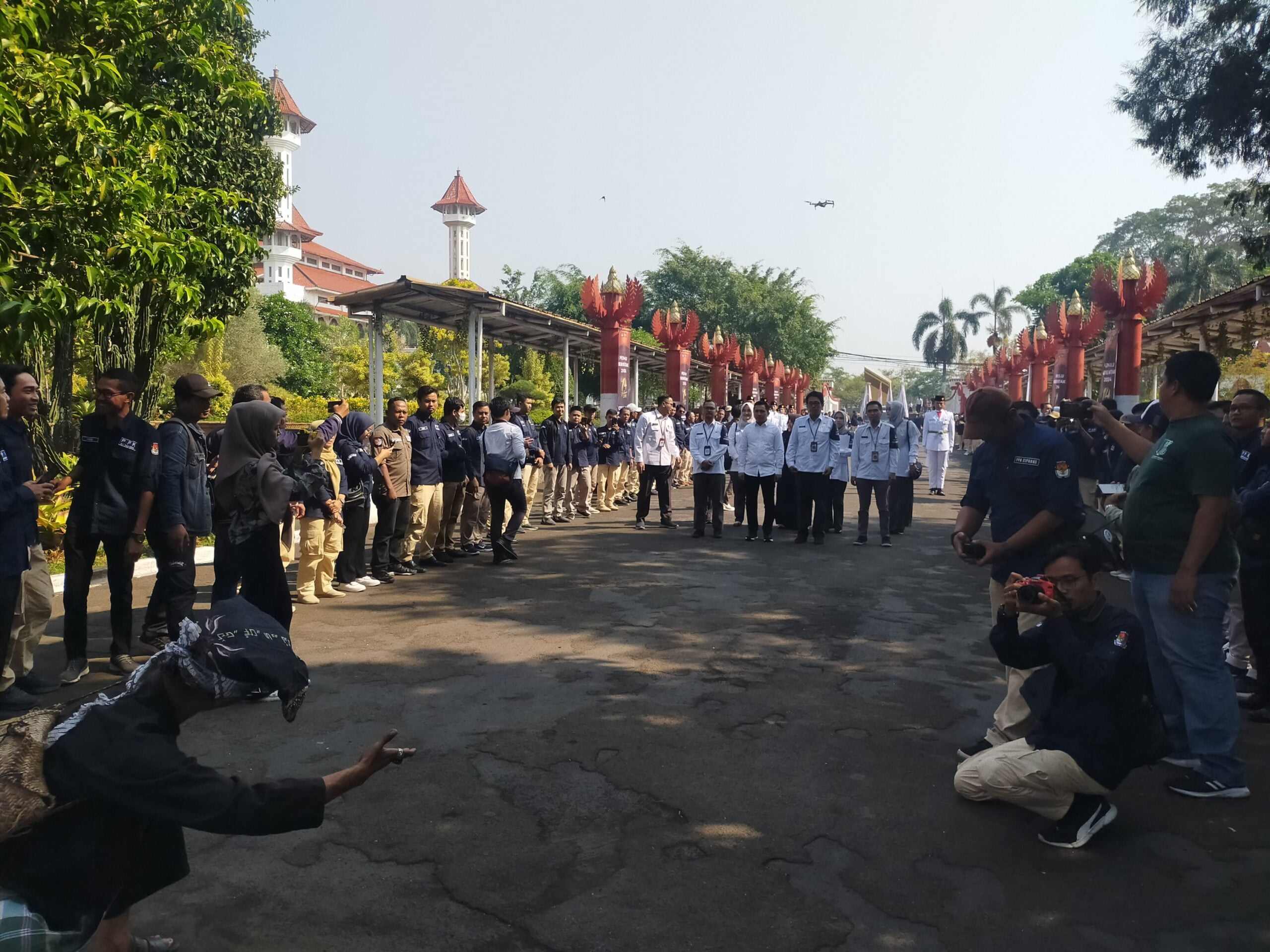 INFORMASIMERAHPUTIH.com l Cianjur l Serah terima kirab pemilu tahun 2024 jalur ll KPU Kota Tasikmalaya kepada KPU Cianjur disambut dengan tarian lengser dihalaman pendopo Jln. Siti Jenab Cianjur, Senin (23/10/23).