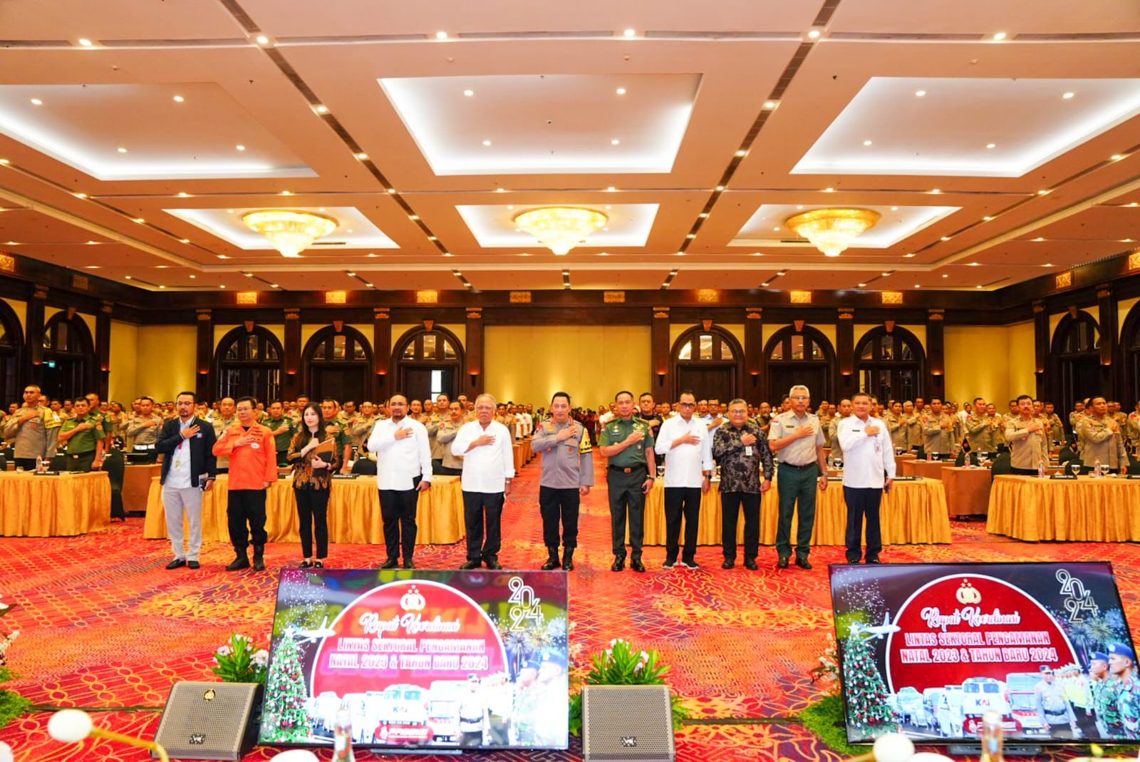 Panglima TNI Jenderal TNI Agus Subiyanto menyampaikan kebijakan TNI dalam perbantuan TNI kepada Polri dalam pengamanan Natal 2023 dan Tahun Baru 2024 (Nataru) yang dipaparkan oleh Asops Panglima TNI Laksda TNI Rachmad Jayadi. Adapun kesiapan TNI dalam mengatasi kerawanan Nataru, TNI akan menyiapkan personel sesuai permintaan dari Polri untuk pengamanan di gereja, bandara -bandara, stasiun kereta api, terminal, pos-pos terpadu, pos pengamanan rest area, pusat perbelanjaan, pelabuhan dan tempat-tempat wisata. Kemudian penyiapan Alutsista guna mendukung pengamanan tersebut berupa helikopter, kapal dan pesawat untuk mendukung angkutan laut dan udara serta evakuasi udara apabila diperlukan.